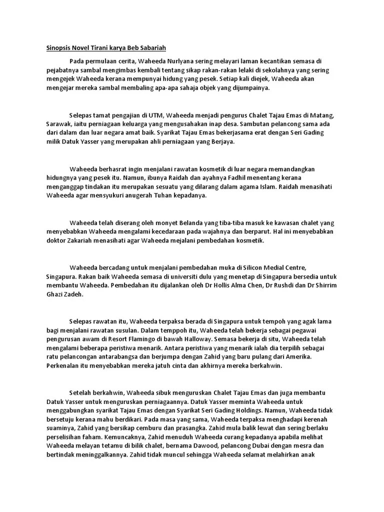 Peristiwa menarik pada bahagian peleraian novel ini. Novel tirani ( beb sabariah) sinopsis keseluruhan tirani mengisahkan tentang. Selain itu, keistimewaan novel tirani yang boleh menarik perhatian pembaca ialah dari segi pemaparan perwatakan watak utama iaitu waheeda. Tirani tugasan 3 banyak peristiwa yang dipaparkan dalam novel mengandungi . (novel tirani ) peristiwa menarik pertama pada bahagian permulaan dalam novel tirani . L peristiwa dalam novel tirani yang boleh dijadikan teladan dan alasan 1 from.